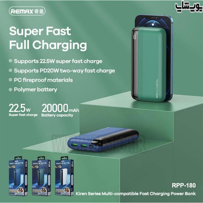 در دنیای امروزه که اکثر امورات زندگی روزمره در بیرون از منزل انجام می گیرد، اتصال به برق شهری یک مشکل اساسی بحساب می آید و کاربران نگران تمام شدن شارژ باتری و خاموش شدن تلفن همراه خود هستند. کمپانی ریمکس برای رفع این مشکل انواع پاوربانک ها را تولید کرده است. ازجمله آنها می توان به پاوربانک فست شارژ 20000 میلی آمپر PD+QC 22.5W ریمکس مدل rpp-180 اشاره کرد. این پاوربانک دارای باتری لیتیوم پلیمر به ظرفیت 20000 میلی آمپر ساعت با قابلیت شارژ سریعن می تواند همزمان 3 دستگاه شما را در کمترین زمان ممکن شارژ کند. پاوربانک 20000 میلی آمپر ریمکس مدل rpp-180 دارای 3 خروجی از نوع پورت تایپ C و 2 USB می باشد که از قابلیت PD+QC 22.5W برخوردار می باشد. با استفاده از این پاوربانک شما می توانید دستگاه مورد نظر خود را در کمترین زمان ممکن بدون صرف وقت شارژ کنید و دیگر نگران اتمام شارژ باتری و خاموش شدن دستگاه خود نباشید. همچنین این پاوربانک دارای دو پورت ورودی می باشد که این دو پورت از نوع تایپ C و میکرو USB می باشند. جنس بدنه این پاوربانک از PC نسوز و پلاستیک فشرده با مقاومت بسیار بالای ABS تشکیل شده که در برابر ضربه و آتش سوزی بسیار مقاوم است. پاوربانک فست شارژ 20000 میلی آمپر PD+QC 22.5W ریمکس مدل rpp-180 دارای یک صفحه دیجیتال LED جهت نشان دادن شارژ خود پاوربانک می باشد. همچنین برای روشن/ خاموش کردن این دستگاه در قسمت کنار آن یک دکمه پاور تعبیه شده است. پاوربانک 20000 میلی آمپر remax rpp180 در ابعاد و وزنی معادل 149x71.4x29 میلی متر و 428 گرم طراحی شده است. براحتی می توان این پاوربانک را در دست خود نگه داشت یا در کیف خود قرار داد و با خود حمل کرد. پاوربانک فست شارژ 20000 میلی آمپر PD+QC 22.5W ریمکس مدل rpp-180 دارای یک باتری لیتیوم پلیمری به ظرفیت 20000 میلی آمپر ساعت می باشد. ناگفته نماند که با این پاوربانک می توان همزمان 3 دستگاه را شارژ کرد. همچنین به دلیل باتری لیتیوم پلیمری این پاوربانک قابل حمل در داخل هواپیما می باشد.